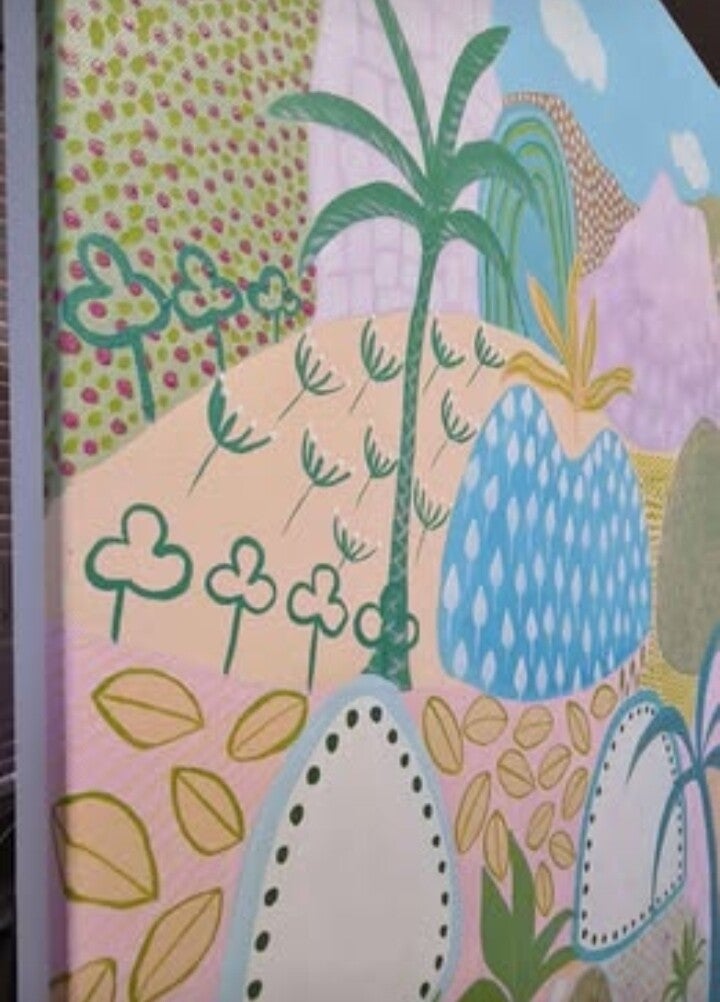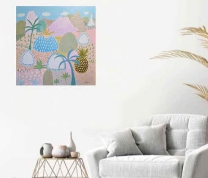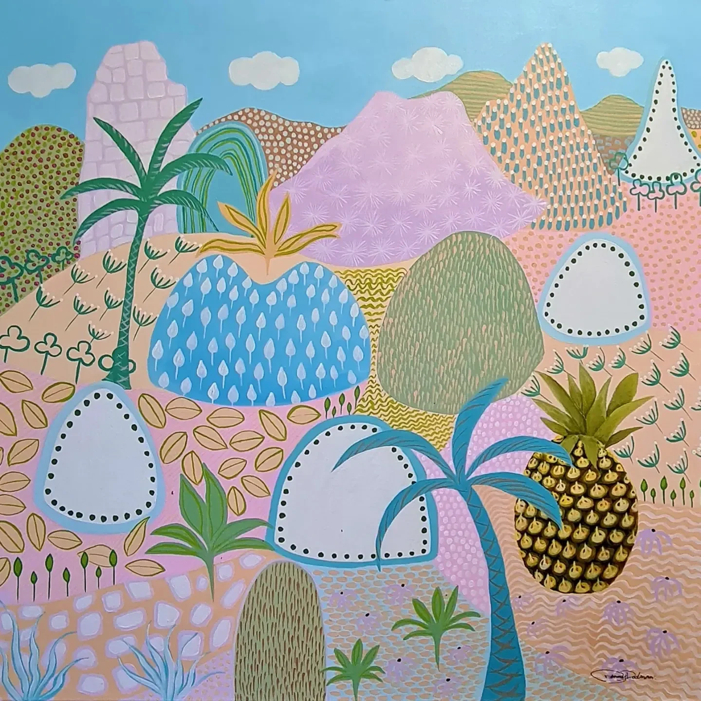 I'm a lover of the Glasshouse Mountains region therefore this region is often the subject of my work. This piece is a fun quirky depiction with an emphasis on the delicious pineapples grown there